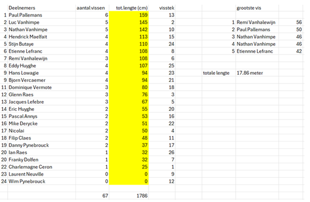 En nu vissen maar. Start om 12u30 – einde 16u30. En wie dacht we niets gingen vangen. Er werden maar liefst 67 vissen gevangen voor een totale lengte van meer dan 17 meter.