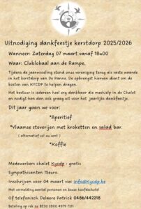 Uitnodiging dankfeestje kerstdorp 2025/2026 Wanneer: Zaterdag 07 maart vanaf 18u00 Waar: Clublokaal aan de Rampe. Tijdens de jaarwisseling stond onze vereniging terug als vaste waarde in het kerstdorp van De Panne. De opbrengst hiervan dient om de kosten van KYCDP te helpen dragen. Het bestuur is iedereen heel erg dankbaar die meehielp in de Chalet en nodigt hen dan ook graag uit voor het jaarlijks dankfeestje. Dit jaar gaan we voor: *Aperitief *Vlaamse stoverijen met kroketten en salad bar. ( alternatief vol au vent ) *Koffie Medewerkers chalet Kycdp : gratis Sympathisanten 15euro. Inschrijven voor 04 maart via: info@Kycdp.be Met vermelding aantal personen en keuze hoofdschotel Of telefonisch Delaere Patrick 0486/442218 Betaling op rek nr BE30 2800 4979 7211